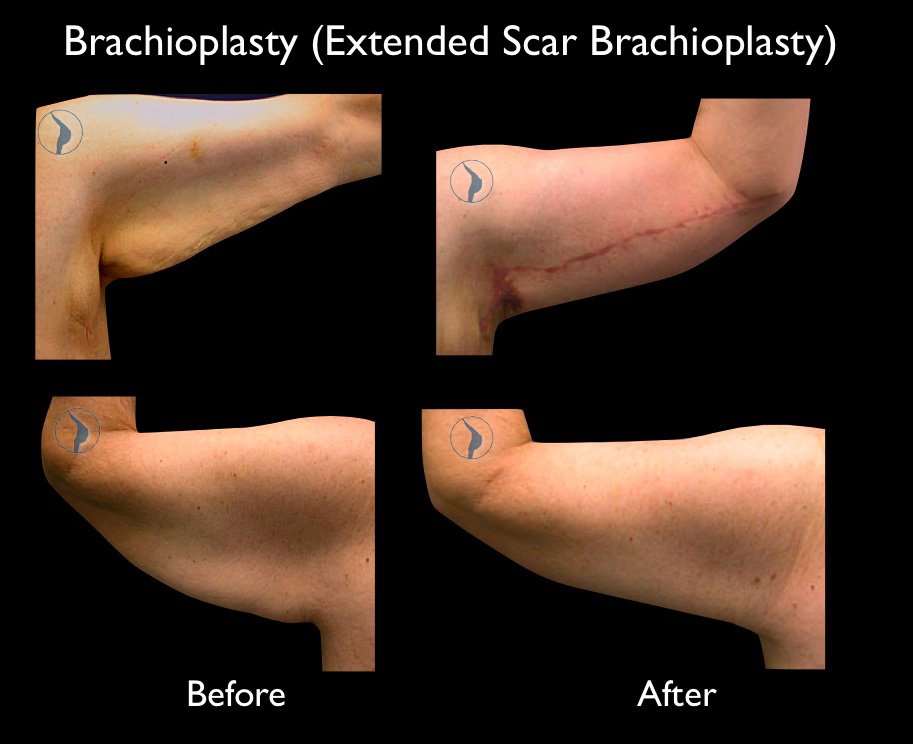 The length and location of the scar depends on the amount of excess skin and flaccidity, thus there is a mini-brachioplasty option (which sometimes offers «mini results») where the cut is minimal and partially hidden in the armpit; or in more advanced cases of sagging, it requires a scar from the underarm to just above the elbow.